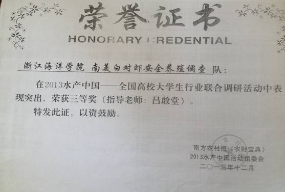 由南方报业传媒集团主办,“农财宝典”广东粤海饲料集团有限公司承办,海南卓越生物有限公司协办的2013水产中国——全国高校大学生行业联合调研活动,于2013年7月份开始,12月份结束全部参赛队伍评奖。本次活动由全国各高校共14支队伍参加,其中浙江海洋学院南美白对虾安全养殖调查队在本调研活动中表现突出,喜获全国三等奖。