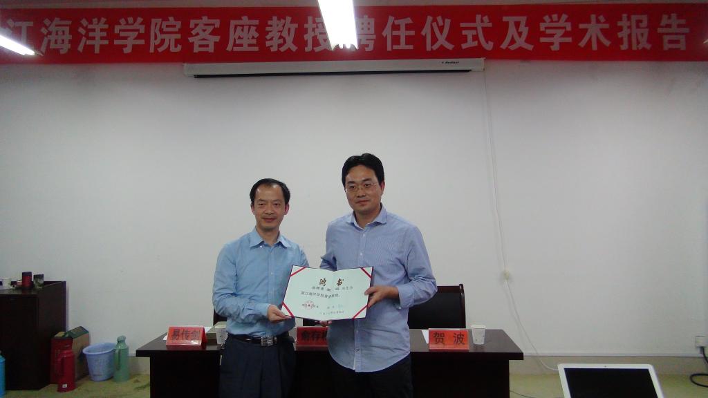 聘任仪式上,校人事处处长易传剑代表学校热烈欢迎贺波与钱洪兴担任我校客座教授,为其颁发聘书。贺波教授表示,感谢浙江海洋学院领导和师生的信任,今后将为浙江海洋学院的专业建设,特别是海洋渔业学科建设方面做出应有的贡献。