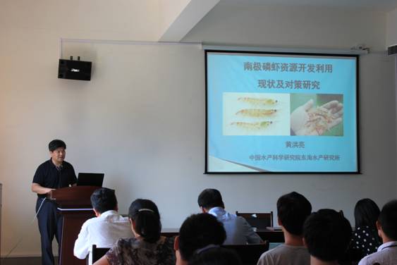 仪式上,宋伟华副院长为大家介绍了新聘任的客座教授的基本情况,希望借此可以增加教师队伍的阵容,把相关专业做大做强,为提高学校的人才培养质量服务。聘任仪式结束后,客座教授黄洪亮为我院师生举办了一场精彩的学术报告会。本次报告会对南极磷虾资源状况、商业开发的历史以及产业现状进行分析和展望,并在南极海洋资源保存委员会(CCAMLR)所提出的预防性渔获量限制等管理措施的背景下探讨我国南极磷虾资源商业化开发的策略。