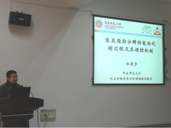 杜震宇教授于2005年分别获得中山大学水生生物学和法国勃艮第大学营养生理学双博士。2012年受聘于华东师范大学,主要承担水产动物营养代谢生理和水产动物营养代谢生理和水产品安全方向的科研和教学,尤其着重鱼类能量代谢的细胞和分子调控机制研究。此次杜教授为大家讲述了鱼类脂肪分解供能的代谢过程及其调控机制,阐明了脂肪发挥“蛋白质节约效应”的分子和细胞生物学机制,对在座师生均受益匪浅。