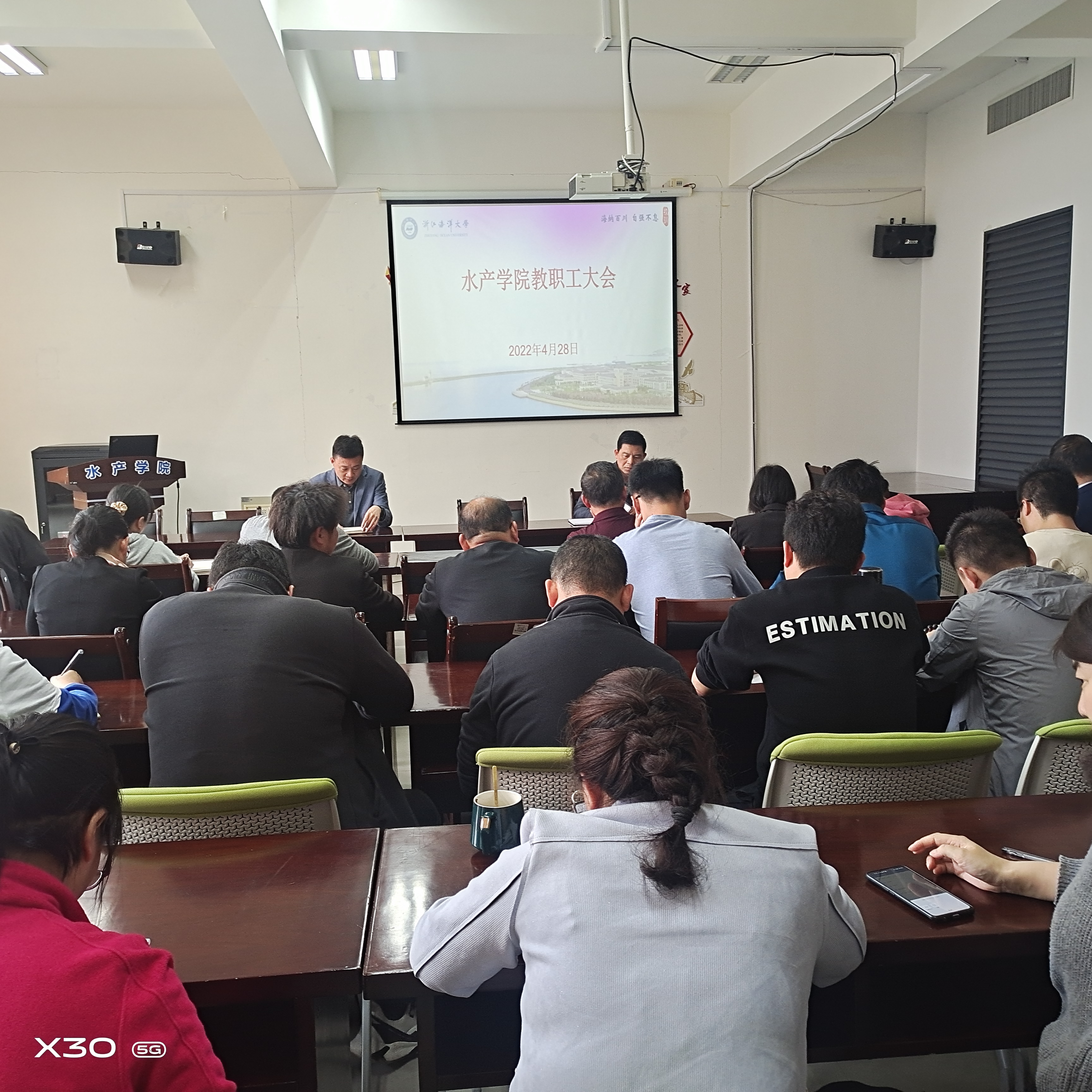 于海科楼263召开全院教职工大会。会议由院长王迎宾主持,党委副书记虞浩臣、副院长钱卫国、徐娜娜及全院教职工参加本次会议。
