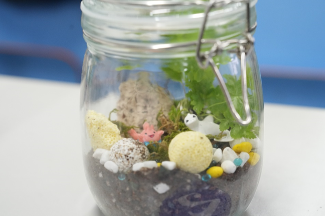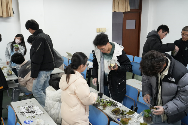 此次活动持续了近三个小时,每位同学都选择了自己想要的小道具,将自己的奇思妙想通过生态瓶创作展现。微型生态瓶造景是将自然中的一角通过自己的理解进行二次创作,完成这样生机盎然的生态瓶,让大家的心灵更贴近自然,心情自是更加舒畅。