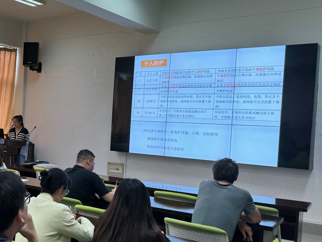 会上,学院实验室安全秘书蔡珊珊解读了《高等学校实验室安全检查项目表(2024年)》,通过实验室安全事故典型案例分析对今年新修订的内容进行重点讲解,进一步强化师生的实验室安全意识,并对近期学院实验室安全检查中发现的隐患问题提出整改措施意见。与会师生对实验室安全检查要点、安全日常管理存在的问题与改进措施进行了深入研讨。
