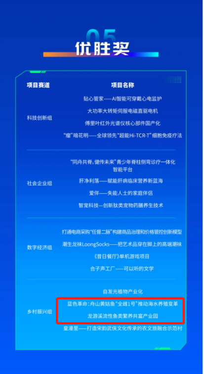 经过初赛和复赛网评,我院研究生Y23渔发1班胡湘浙《龙游溪流性鱼类繁养共富产业园》、Y23水产帅雁《蓝色革命:舟山黄姑鱼“全雌1号”推动海水养殖变革》项目成功入选40强,进入2024年“创青春”浙江省青年创新创业大赛现场路演。最终,喜获2项优胜奖。