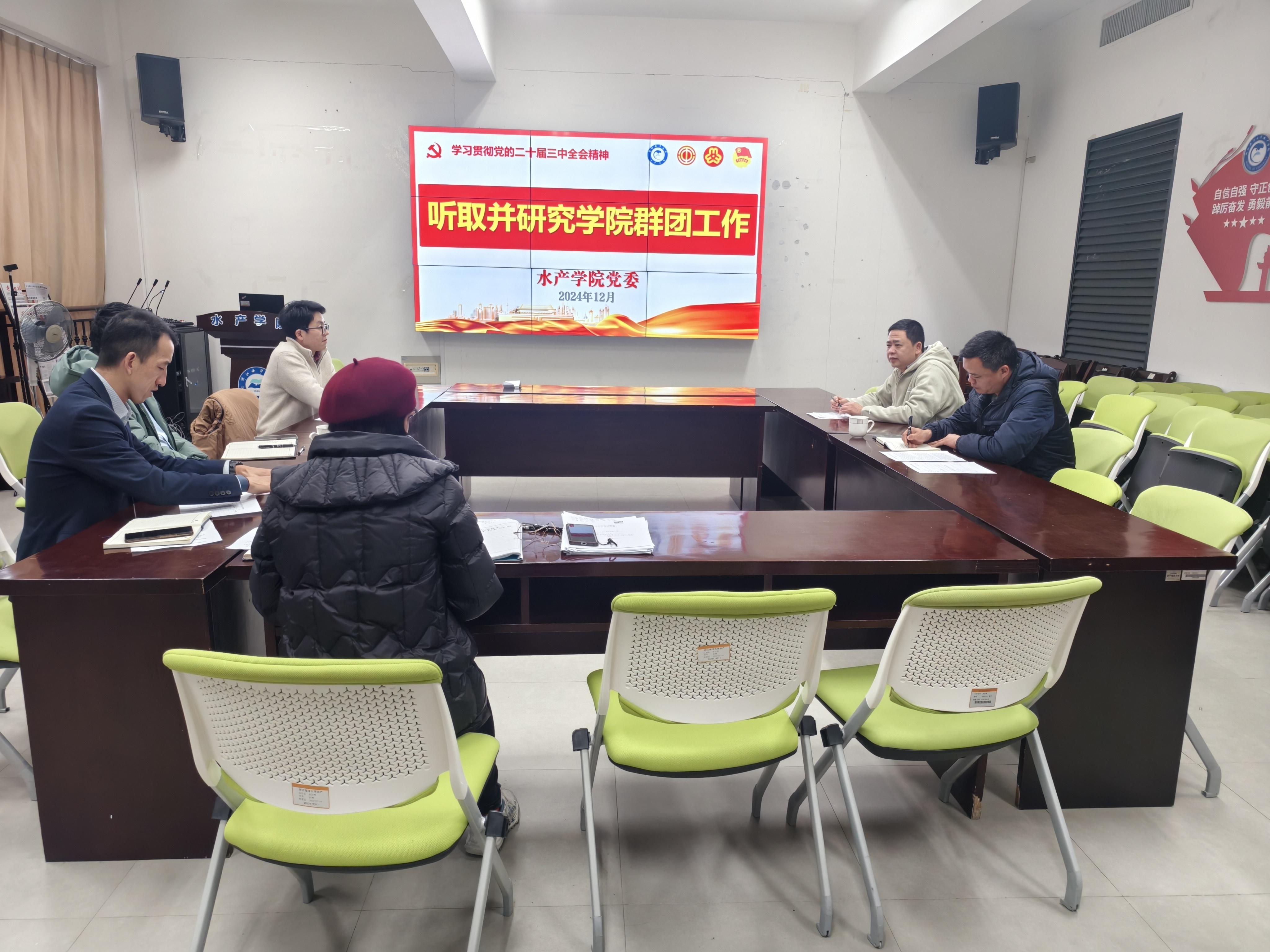 在海科楼263党员之家召开党委会,听取并专题研究学院群团工作,会议由学院党委书记薛利建主持。会议听取了学院工会、妇联、共青团、学生会、研究生会一来以来工作开展情况和下一阶段工作打算的汇报。