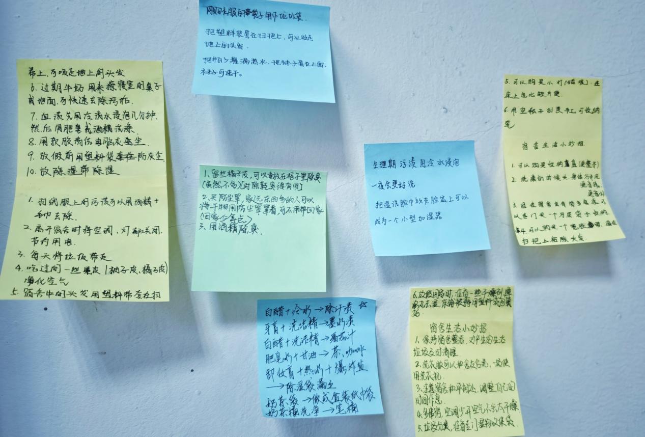 分享过程中,大家将自己的生活智慧写在便利贴上并张贴在宿舍拐角墙面,一时间,墙面贴满了各种实用技巧,形成了一道独特的“知识墙”。同学们在分享与交流中,不仅学到了实用的生活技巧,还拓宽了视野,感受到了社区生活的温暖与美好。