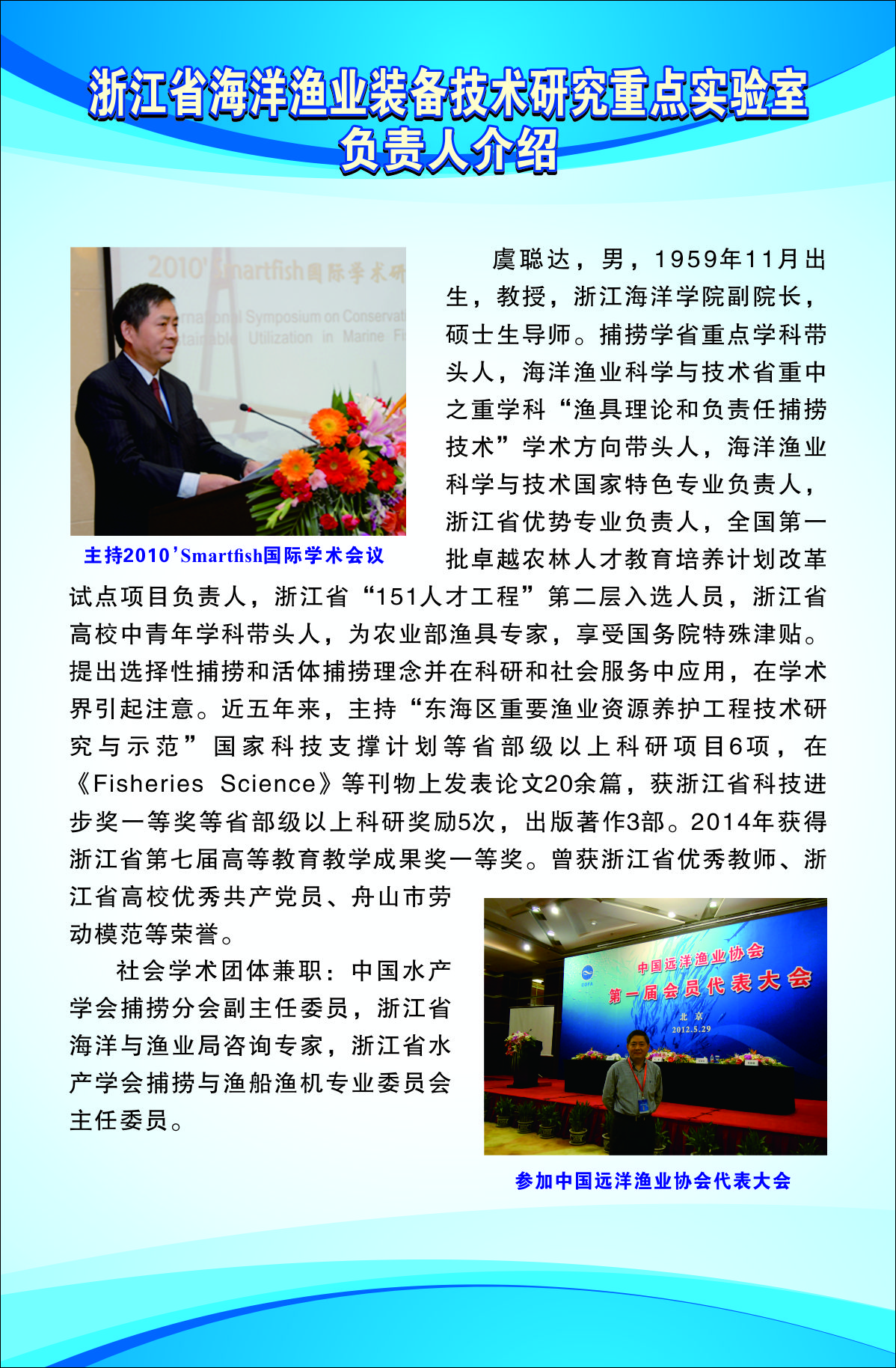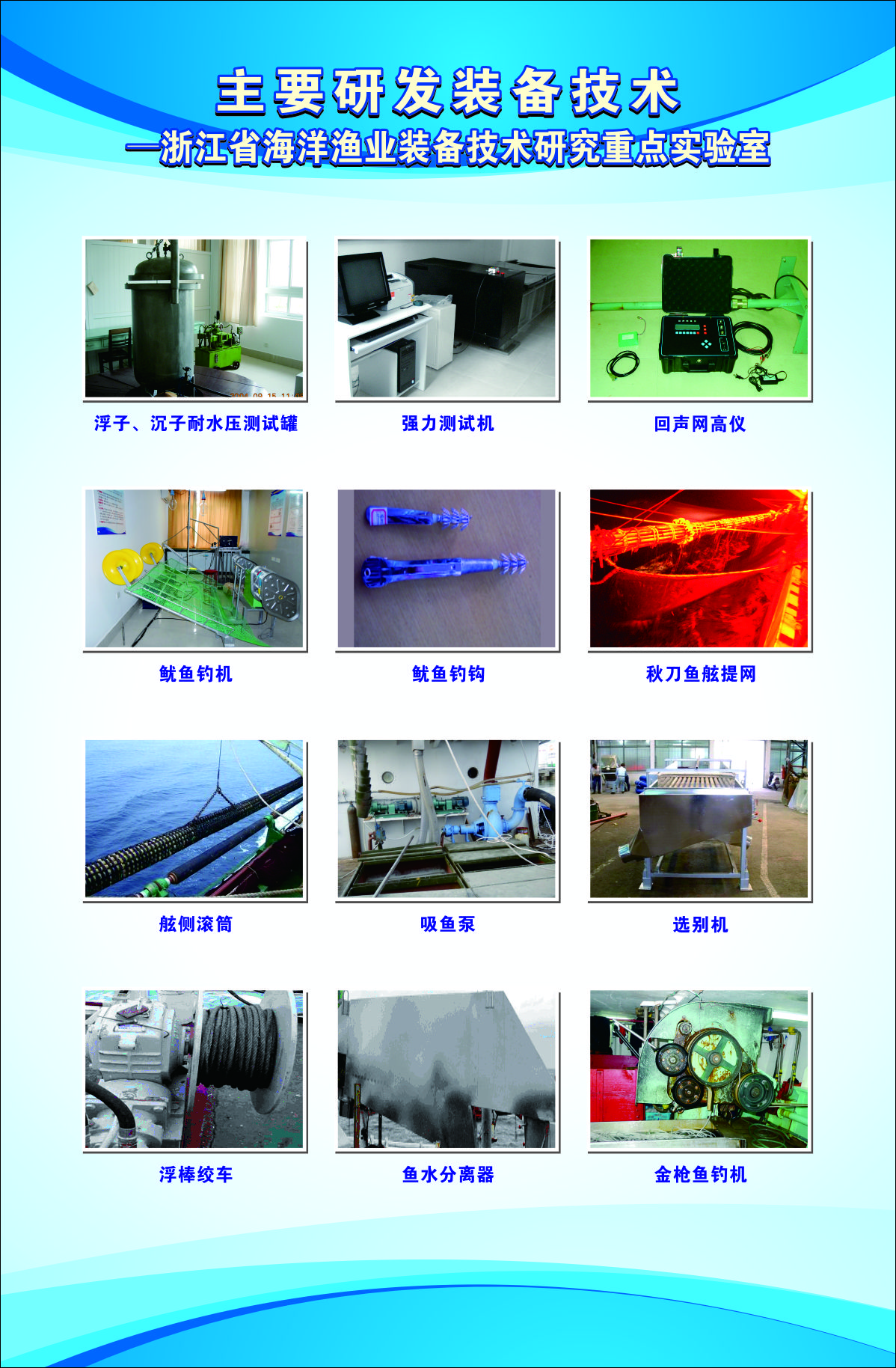 浙江省海洋渔业装备技术研究重点实验室由浙江海洋学院组织申报建设,在浙江省科学技术厅领导下,由浙江海洋学院牵头联合浙江省海洋水产研究所、宁波捷胜海洋装备股份有限公司、中国水产舟山海洋渔业公司、浙江省远洋渔业集团股份有限公司等共同组建。实验室围绕现代海洋渔业发展方向,以渔具水动力性能和渔业装备机械性能为基础研究,加强高性能渔具材料与工艺、生态友好型渔具渔法、远洋渔具渔法等捕捞渔具技术研究。