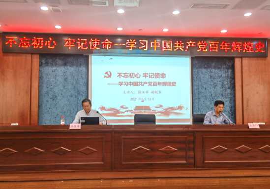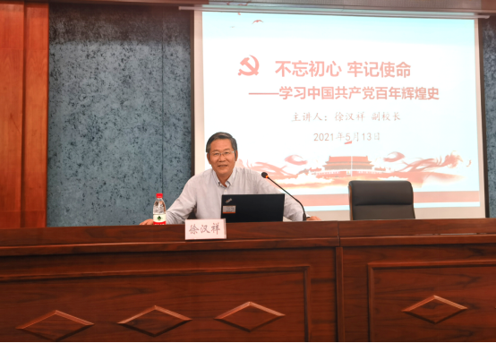 徐汉祥副校长的宣讲以《不忘初心 牢记使命—学习中国共产党百年辉煌史》为主题,强调要认真学习贯彻习近平总书记在党史学习教育动员大会上的重要讲话精神,充分认识开展党史学习教育的重大意义,深刻领会开展党史学习教育的重点任务,准确把握开展党史学习教育的工作要求,深入扎实开展党史学习教育,切实做到学史明理、学史增信、学史崇德、学史力行。