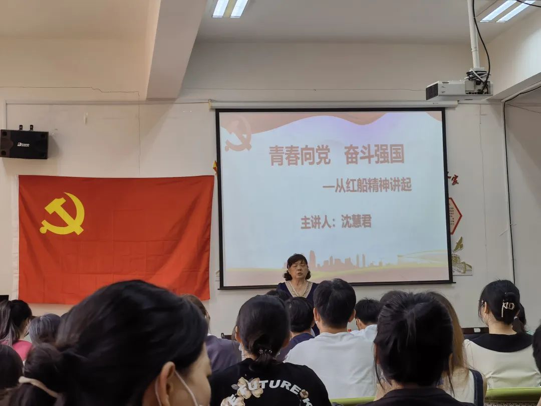 沈慧君老师从红船精神引出,用简洁凝练的概念表述,为在场的学生党员介绍了什么是青春、红船精神、四有青年等,并佐以生动形象的故事案例。沈老师鼓励在场学生党员要牢记党史,铭记南陈北李相约建党、陈延年陈乔年两兄弟英勇事迹,指明青春就是把自己的生命与人民和祖国绑定在一起的样子,