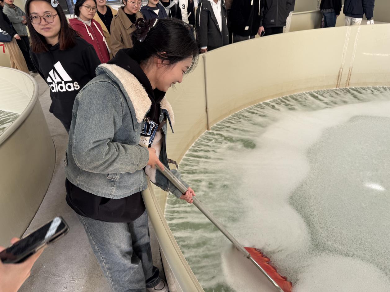 大棚内10个圆形养殖池有序分布,分别养殖对虾、绿鳍马面鲀、鮸鱼、虎头鱼等多类品种。每个养殖池均配备独立循环水系统,通过电脑控制实现水质精准调控与饵料科学投喂。“智能化养殖不仅降低成本,更能保障水产品生长环境,实现品质可控。”负责人的讲解让同学们对“科技兴农”有了更直观的体会。