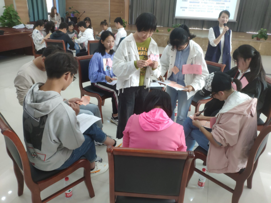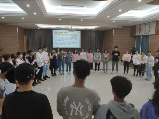 活动中,陈南菲老师首先介绍本次活动的目的和规则,活动分为“别样相识”、“我的喜悦与自豪”、“压力信号与应对”、“欣赏与祝福”四个部分。陈老师通过游戏的方式将所有同学进行分组,小组成员互相交换自己的“别名”,并简单介绍其由来与个人爱好,活跃了小组氛围。接着,每个成员在下发的表格中填写了各个时期让自己感到喜悦或自豪的事情,以及事件中所具备的特质与能力。同学们发现和识别自己的压力信号、信号源、内在需求和有效对策,并进行小组交流。最后,各小组成员为小组内其他人员分别寄予了真挚的祝福。