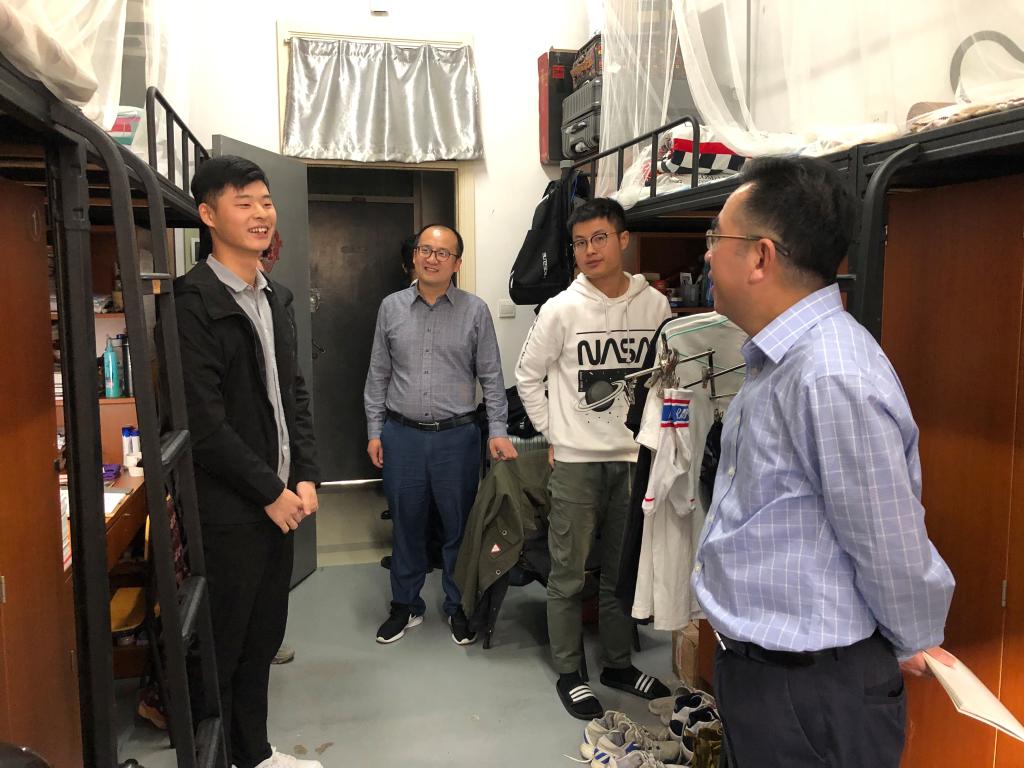 在联系学生寝室,虞剑锋部长与同学们进行了亲切交谈,详细询问了他们在学业课程、大学规划、毕业去向等方面情况。当了解到学生所在团支部曾获得学校“五四红旗团支部”时,虞部长对他们在思想、组织、学风等方面给予肯定。同时,虞部长还认真听取了同学们对学校的建议和意见。