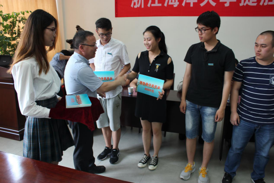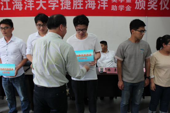 讲话结束后,颁奖开始,研工部部长、研究生处处长李强宣读获奖学金名单。A13海渔的谢剑涛等7名本科生和Y15渔业的董静瑞等3名研究生获得捷胜海洋奖学金,谢永和校长和陈勇副总经理为获奖学生颁奖。