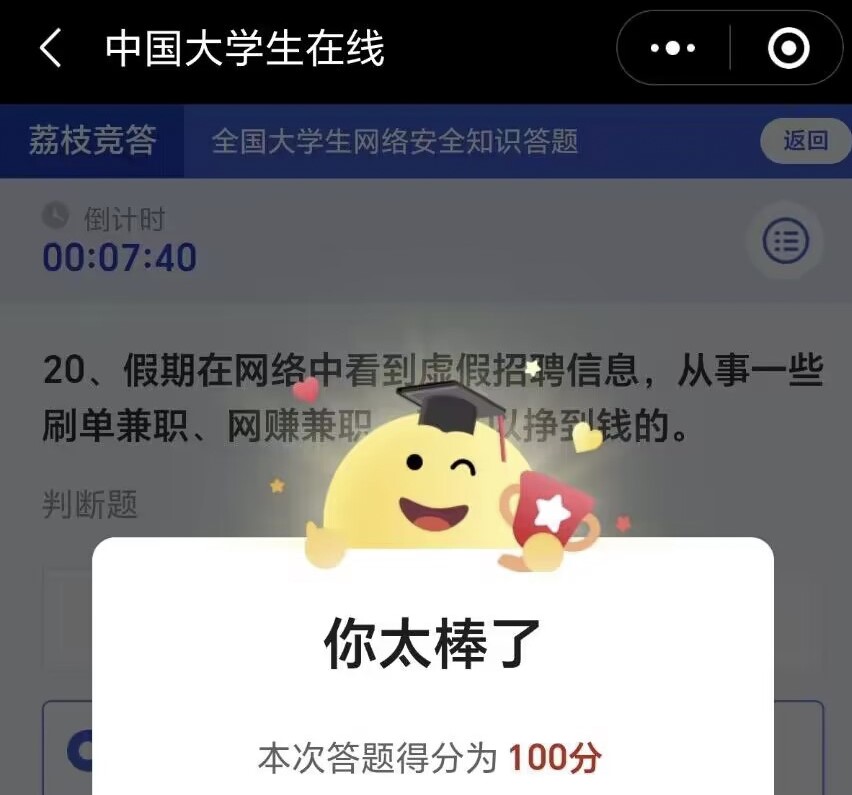 组织学生参加全国大学生“守护青春 网络有你”安全知识答题活动,通过线上答题增长学生网络安全知识。“随意下载邮箱附件也有风险?”、“用户手机上的信息资料是何时被盗取的?”,“网络兼职有风险?” 沉浸式答题活动现场,开展互动宣传教育。