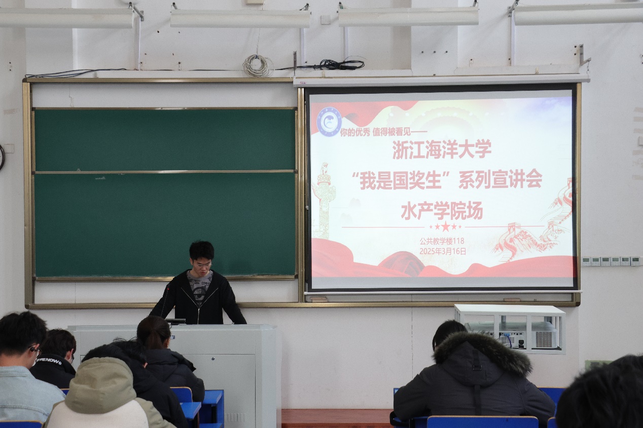 于2025年3月16日在公共教学楼118教室举办“我是国奖生”主题宣讲会。本次活动以“国奖生辉·水产筑梦”为主题,邀请国家奖学金获得者王奕梦、周钟楠两位优秀学子担任主讲,通过分享成长历程、传授学习经验,助力在校生明晰学业规划、汲取奋进力量。