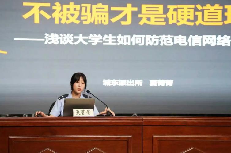 9月24日,学院邀请城东派出所民警夏菁菁走进校园,为新生开展防范电信网络诈骗专题培训,进一步深化警校联动协作。培训聚焦大学生群体中高发的诈骗类型,结合真实案例进行深入剖析,引导学生树立“不轻信、不透露、不转账”的安全防范意识,切实增强对诈骗手段的识别与应对能力。